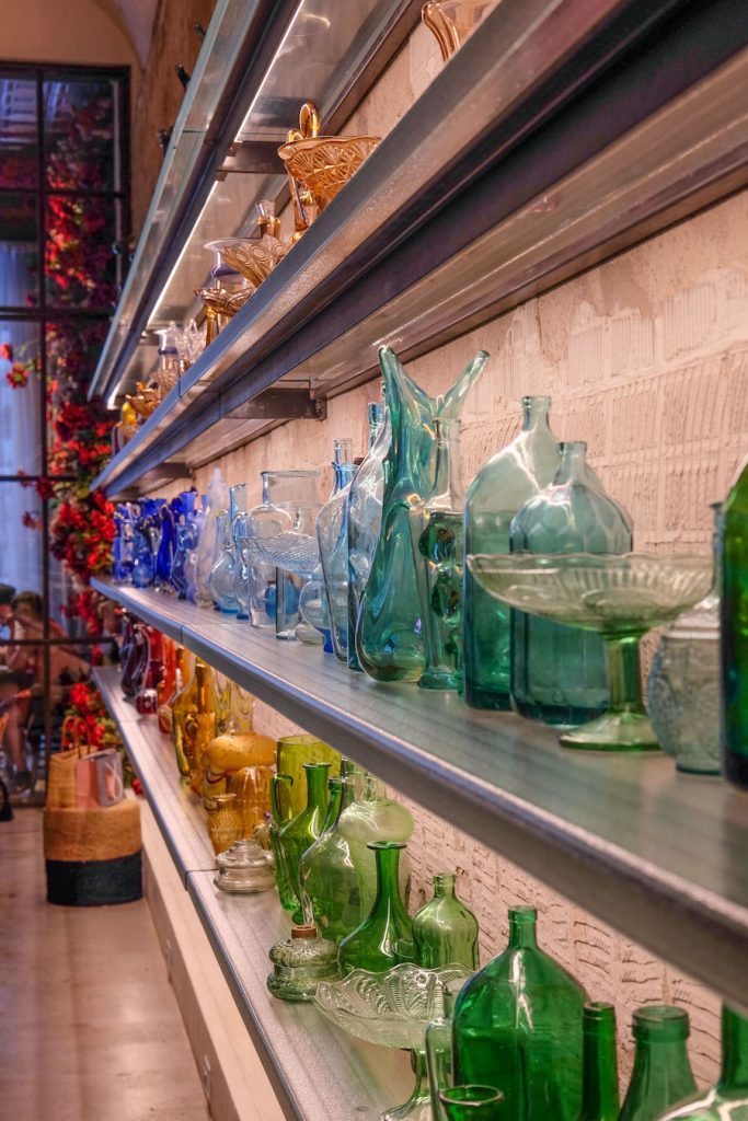 C’è un dettaglio che non è mai cambiato dal 2015: è il gigantesco tavolo conviviale, situato nella navata di sinistra, che è stato ricavato da tavole di quercia secolare dal diametro di quasi 4 metri. Alle sue spalle è stata creata una scenografica installazione, a cura del vintage store Dall’Origine, con una selezione di oggetti di vetro soffiato che include bottiglie, vasi, alzatine, bicchieri, recuperati attraverso mezza Europa e datati tra il 1940 e il 1980, dalle tonalità più dense e calde a quelle più chiare e fredde.