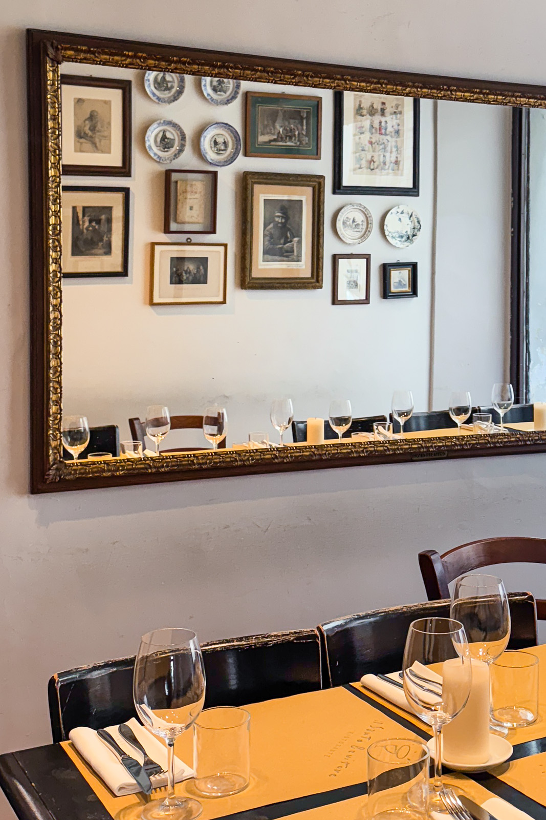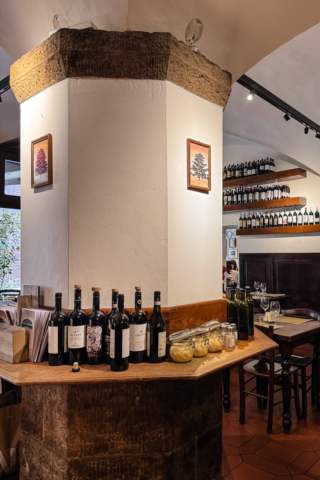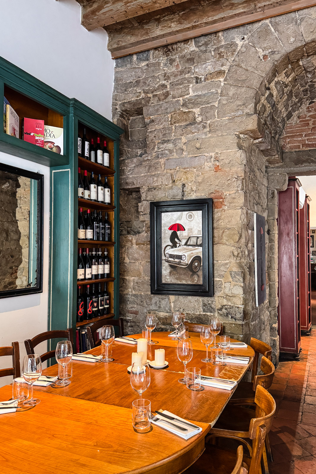 Il design: luci soffuse, candele che colano su tavoli di legno massiccio, boiserie scure e pareti rivestite di bottiglie che sembrano custodire segreti millenari. L’atmosfera è quella di un bistrot parigino che ha scelto di vestirsi con i colori della terra toscana.
